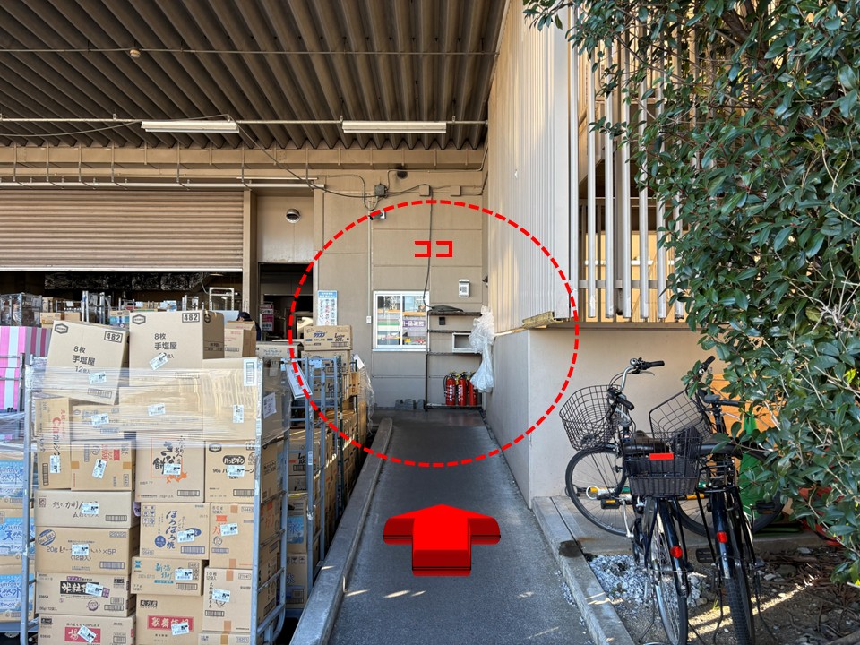 アルバイト面接や初出勤、取引先として訪問する方が迷わないよう、従業員出入口までの行き方を写真で詳しく案内しています。