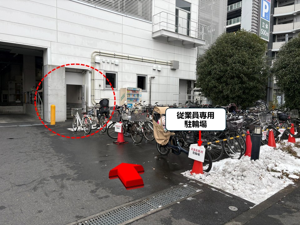 - 従業員用駐輪場: 表記あり、従業員出入口付近にあり