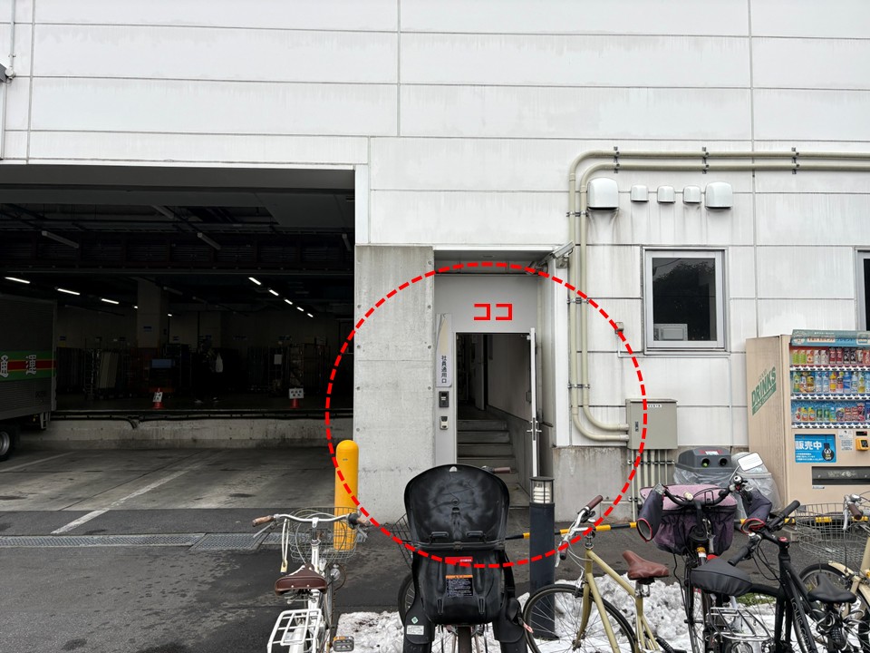 イオンもテナントの一部なので、基本的にイオン専用の出入口はないです。複合施設の従業員が利用する出入口を案内しています。