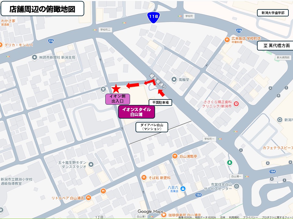 - 最寄り駅: JR東日本 越後線 白山駅 徒歩9分程度