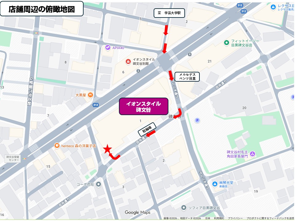 - 交通量の多い、目黒通り沿いの店舗。近隣にはメルセデス・ベンツ、LEXUSなど高級車を販売する店舗が立ち並ぶ。イオンスタイル碑文谷は、7階建。店舗の真向かいにもイオンの3階建ての別館があり、自転車も販売。店舗内の地下1階の駐車場は満車になりやすい。
