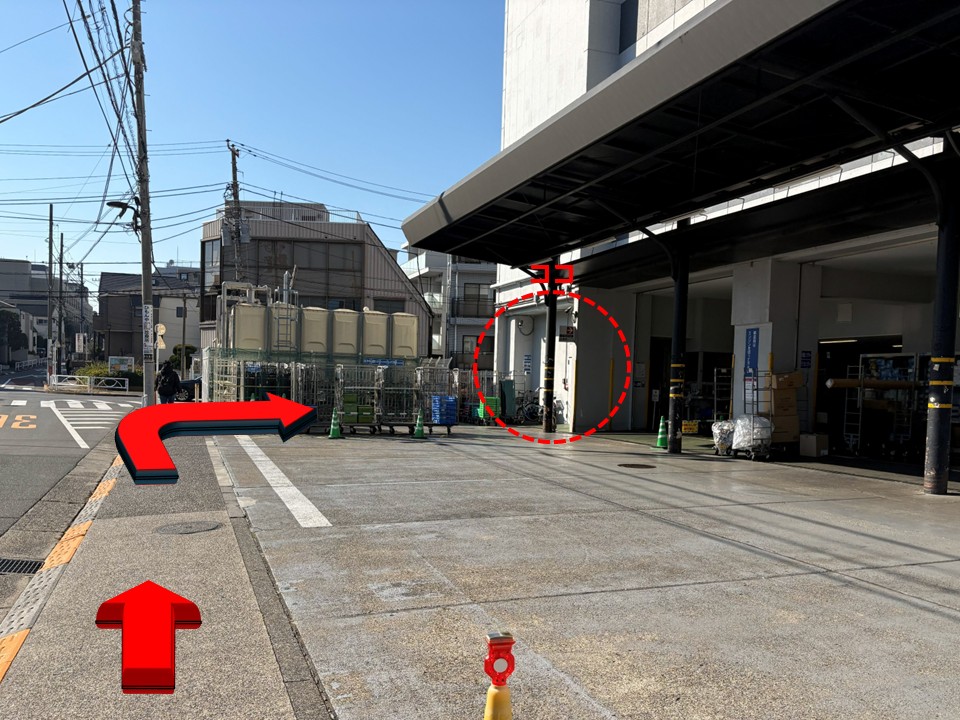 アルバイト面接や初出勤、取引先として訪問する方が迷わないよう、従業員出入口までの行き方を写真で詳しく案内しています。