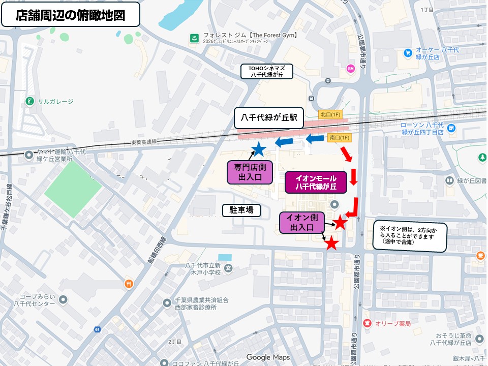 • 最寄り駅: 東葉高速鉄道 八千代緑が丘駅南口から店舗2Fへ直結