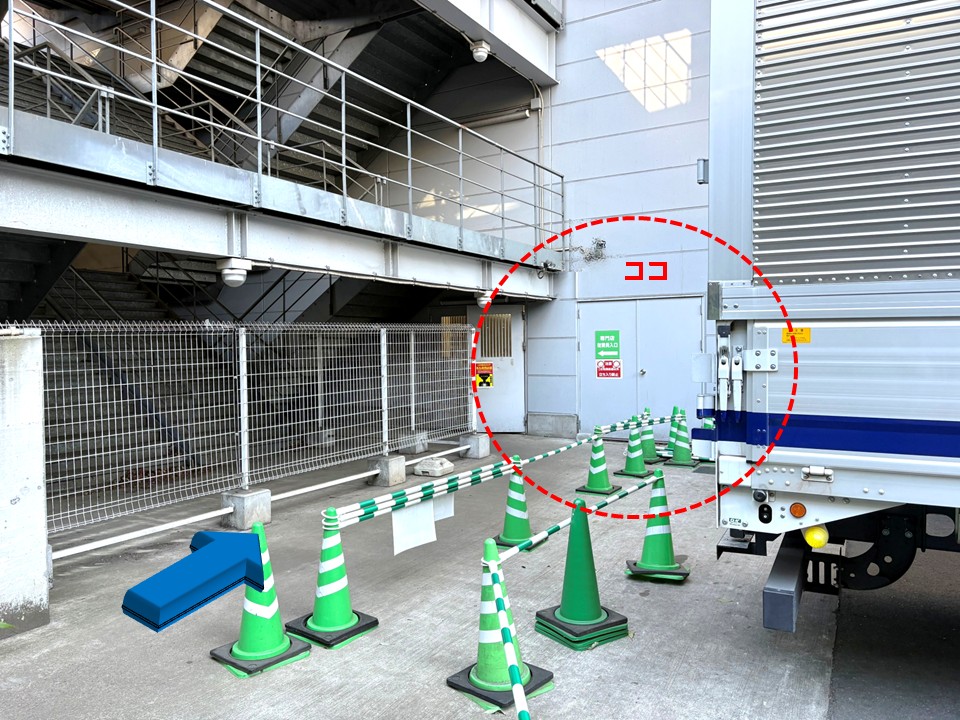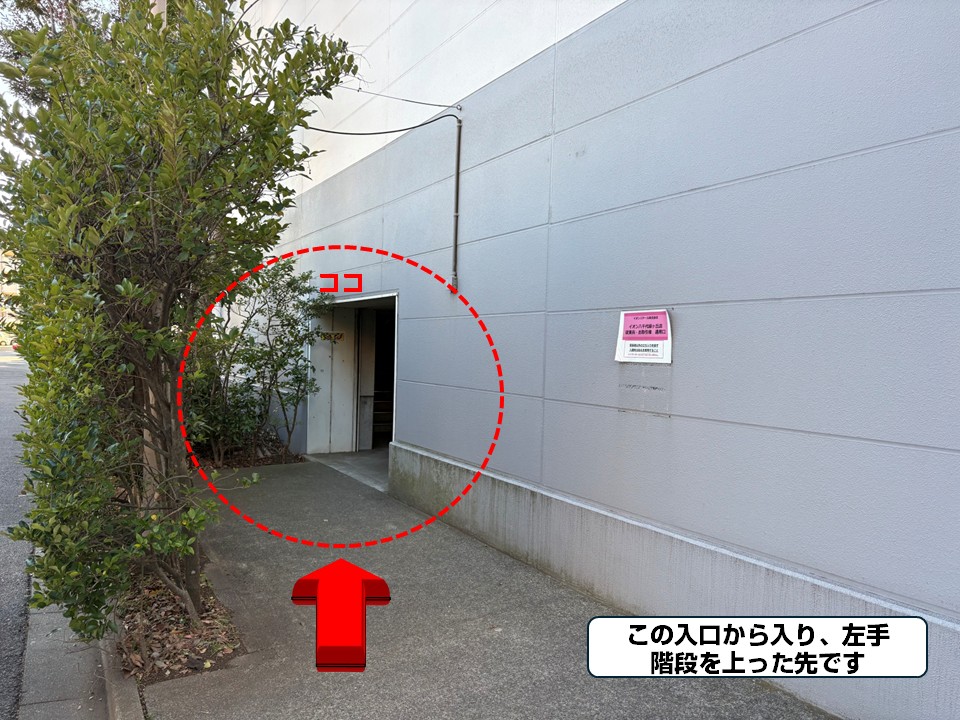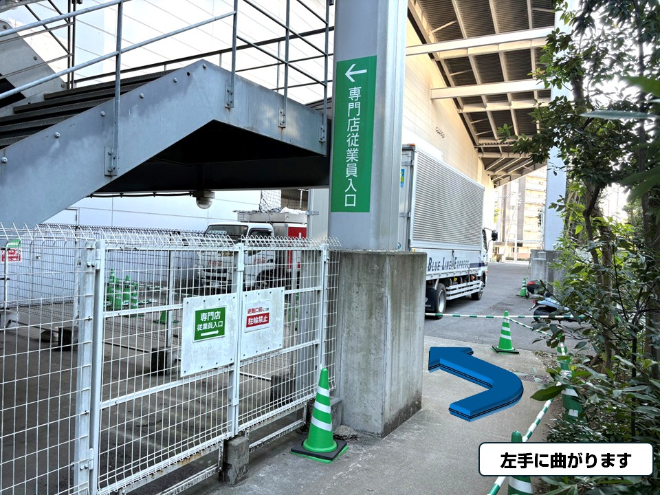 アルバイト面接や初出勤、取引先として訪問する方が迷わないよう、従業員出入口までの行き方を写真で詳しく案内しています。