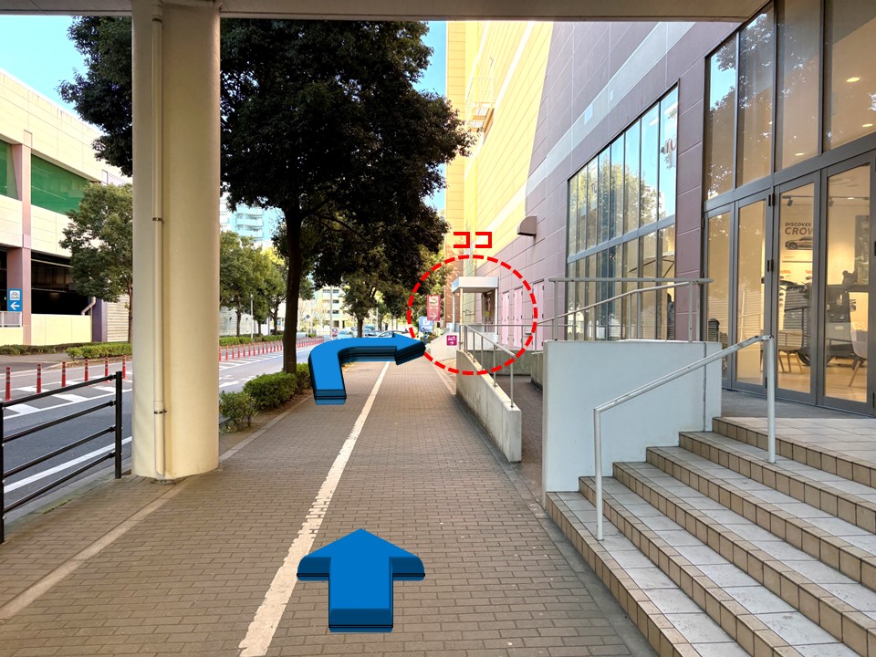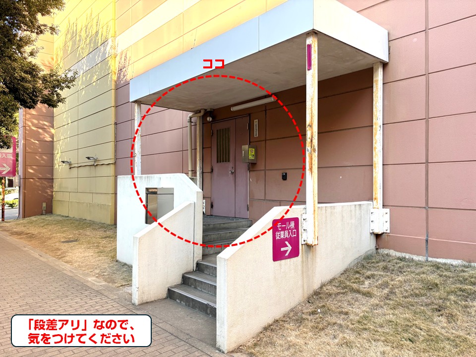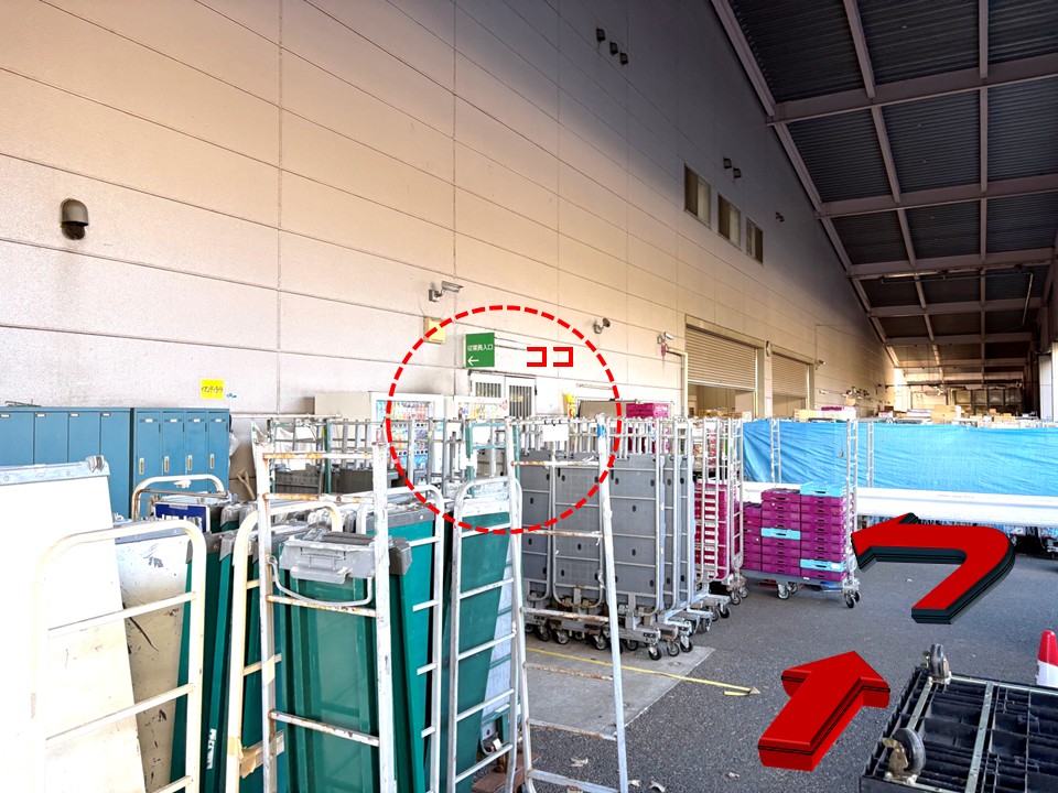 アルバイト面接や初出勤、取引先として訪問する方が迷わないよう、従業員出入口までの行き方を写真で詳しく案内しています。