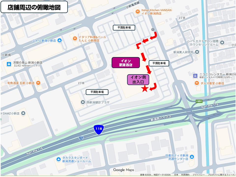 • 2022年7月、西側の平面駐車場内には、西新潟健診プラザが開院。人間ドック、健康診断も受けられます。